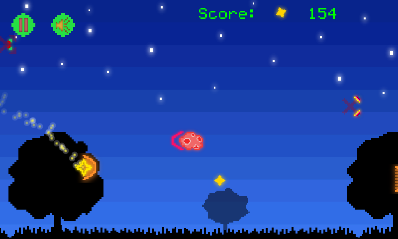 Game in pixel style. Main idea is to fly with our hero as far as we can, and collect little stars to get points.